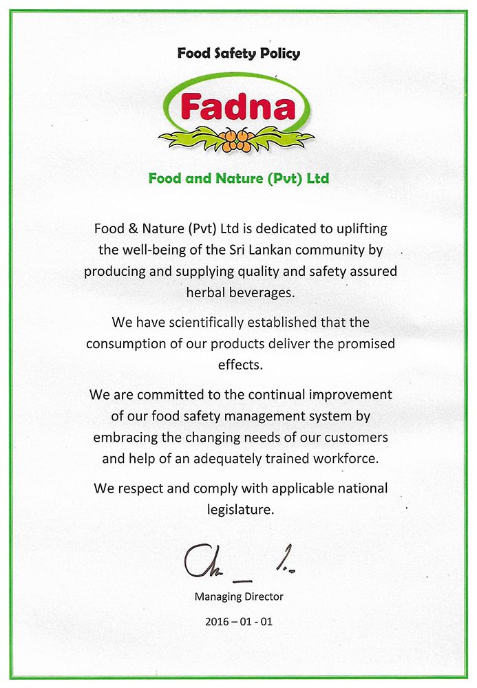 Food & Nature (Pvt) Ltd., is dedicated to uplifting the well-being of the Sri Lankan community by producing and supplying quality and safety assured herbal beverages.